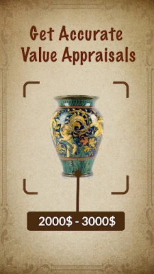 Ma Antique Identifier va ben oltre il mero riconoscimento. Approfondisci la conoscenza di ogni singolo pezzo grazie a dettagliate descrizioni che esplorano l'artigianato, il contesto culturale e il significato storico che lo hanno plasmato. Comprendi veramente il valore intrinseco e la narrazione di ogni oggetto. Inoltre, per chi desidera conoscere il potenziale valore di mercato, l'applicazione offre stime di valutazione chiare e intelligenti. Queste sono basate su confronti con articoli simili, dati storici e attributi di stile, rendendola uno strumento prezioso per collezionisti, rivenditori, eredi di patrimoni o chiunque desideri capire la quotazione dei propri cimeli.