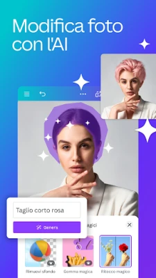 Il cuore pulsante di Canva risiede nella sua suite di funzionalità all'avanguardia, potenziate dall'intelligenza artificiale per un tocco di magia in ogni progetto. Prova la "Magia del Design" per generare layout da semplici immagini, oppure la "Magia del Ritocco Fotografico" per modificare elementi nelle tue foto con precisione sorprendente. Rimuovi oggetti indesiderati con la "Gomma Magica" o espandi la tua portata globale traducendo automaticamente i tuoi progetti in oltre 100 lingue. L'editor fotografico integrato, privo di pubblicità e watermark, ti consente di ritagliare, regolare luminosità e contrasto, applicare filtri professionali e sfocare lo sfondo per mettere in risalto il soggetto. Non da meno, il video editor offre la creazione di clip professionali con transizioni fluide, animazioni coinvolgenti e un'ampia libreria di tracce audio.