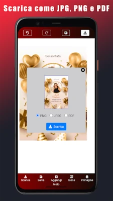 Una volta perfezionato il tuo capolavoro, potrai esportarlo in alta risoluzione nei formati JPEG, PNG o PDF, perfetto per la stampa professionale o per una condivisione istantanea tramite email, WhatsApp, Messenger e tutti i principali social media. Inizia oggi stesso a creare inviti memorabili che incanteranno i tuoi ospiti. Per qualsiasi domanda o feedback, non esitare a scriverci a