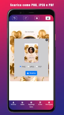 Una volta perfezionata la tua creazione, la flessibilità è fondamentale. Gli inviti possono essere salvati e pronti all'uso in formati universali e di alta qualità come PNG, JPEG e PDF, garantendo una stampa impeccabile o una visualizzazione nitida su qualsiasi dispositivo. La condivisione è resa altrettanto semplice: spedisci i tuoi capolavori direttamente tramite e-mail o attraverso le tue app di messaggistica preferite, raggiungendo i tuoi invitati con un semplice tocco. Dimentica le complicazioni e concentrati sull'attesa del tuo evento.