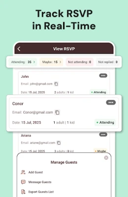 Ma 1Invites va oltre la semplice creazione grafica, offrendoti una suite completa per la gestione degli invitati. Dimentica fogli di calcolo disordinati: il nostro sistema di gestione RSVP integrato traccia automaticamente le conferme, i rifiuti e le risposte in sospeso in tempo reale. Organizza la tua lista ospiti con estrema facilità, annotando preferenze alimentari, accompagnatori e note speciali. Con la certezza di sapere chi parteciperà, puoi pianificare ogni aspetto del tuo evento con fiducia e precisione, assicurandoti che nessun dettaglio venga trascurato. 1Invites, sviluppato da OptimumBrew, è la tua chiave per un'organizzazione fluida e senza imprevisti, garantendo che ogni evento sia un successo memorabile.
