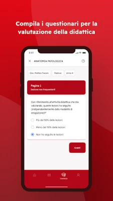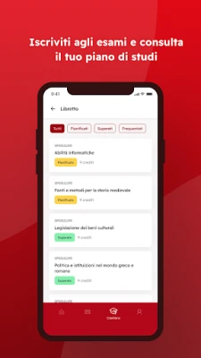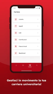 Dimentica le lunghe attese o la ricerca di informazioni sparse: ora hai tutto a portata di mano. Con pochi tocchi, puoi monitorare l'andamento del tuo libretto elettronico e consultare statistiche dettagliate sui tuoi progressi. Visualizza con chiarezza i tuoi piani di studio, compila i questionari di valutazione della didattica e gestisci gli appelli d'esame in ogni loro fase, inclusa la fondamentale opzione di rifiutare un voto, se necessario. Non solo: avrai sempre accesso alle informazioni sulle tue tasse universitarie e potrai utilizzare il tuo badge digitale direttamente dal telefono.