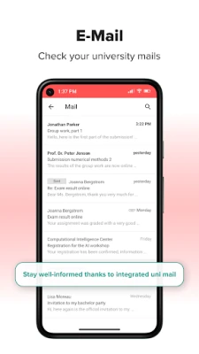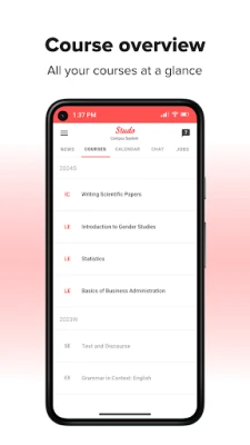 Immagina di avere il controllo totale del tuo semestre: con Studo, la consultazione dei tuoi corsi e lezioni è immediata, con accesso rapido a documenti e orari. Il calendario integrato ti assicura di non perdere mai un appuntamento accademico, mostrando chiaramente quando e dove si svolgono le tue attività. Restare connessi è facile grazie alla chat interna, perfetta per scambiare informazioni con i tuoi colleghi, chiedere delucidazioni o organizzare sessioni di studio. E non solo: Studo ti aggiorna quotidianamente sui menù della mensa universitaria, ti mostra le migliori offerte di lavoro per studenti nella tua città e ti avvisa in tempo reale sull'esito dei tuoi esami, aiutandoti anche a calcolare la media dei voti. Il client di posta elettronica integrato ti mantiene sempre in contatto con docenti e colleghi, mentre la sezione notizie ti informa su eventi e sviluppi nel campus e dintorni. Con oltre 30 funzionalità, Studo è il tuo assistente personale per un'esperienza studentesca ottimizzata.